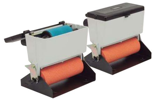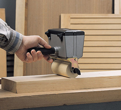 Hand gluer for glueing large surfaces using vinyl glue (White). Lower roller width: 180 mm. Equipped with trigger shut-off device to stop the flow of glue. Also comes with a support where it can be left when not in use, thus keeping the working area and the machine clean. Moreover, is equipped with an upper auxiliary roller for clean glueing of strips.