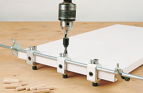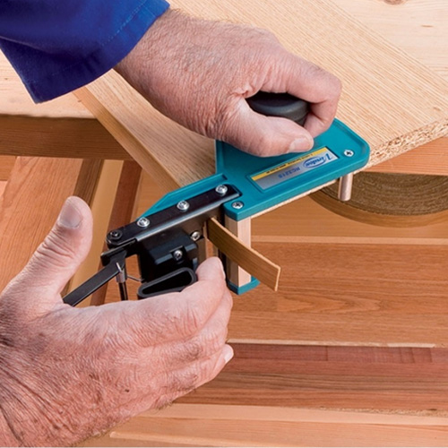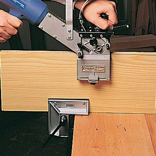 For joining 16 and 19 mm boards using blocks (Ø 8 mm) or screws. High quality finish with no need for later adjustment. Any type of joint can be made, either square jointing or centre board jointing. Ideal for various professional uses such as: small jobs, making small orders, adjustments, repairs etc. The standard kit includes the following items: supplements for 16 mm boards, reducer screws and stop for chuck.