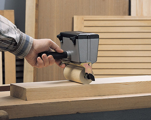 Hand gluer for glueing large surfaces using vinyl glue (White). Lower roller width: 180 mm. Equipped with trigger shut-off device to stop the flow of glue. Also comes with a support where it can be left when not in use, thus keeping the working area and the machine clean. Moreover, is equipped with an upper auxiliary roller for clean glueing of strips.